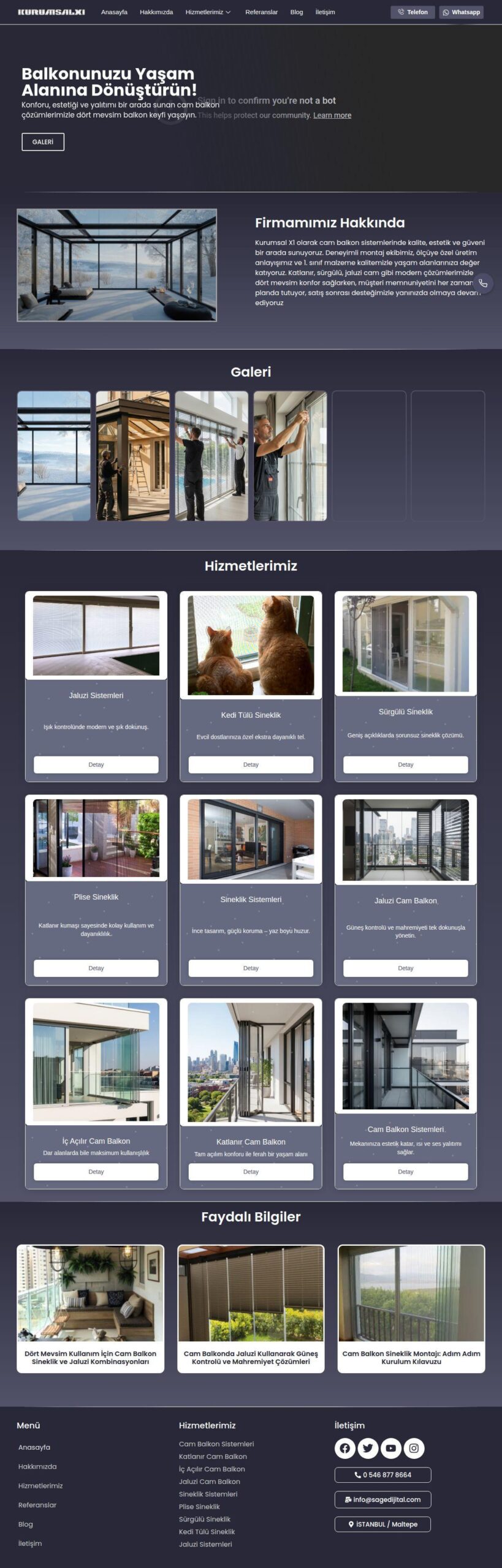 Cam balkon, PVC doğrama, pergole sistemleri, yapı-dekorasyon ve daha birçok kurumsal sektöre özel olarak geliştirilen çok amaçlı bir WordPress temasıdır. Modern arayüzü, sabit iletişim butonları ve referans galerisiyle şirketinizi dijitalde en iyi şekilde temsil eder.